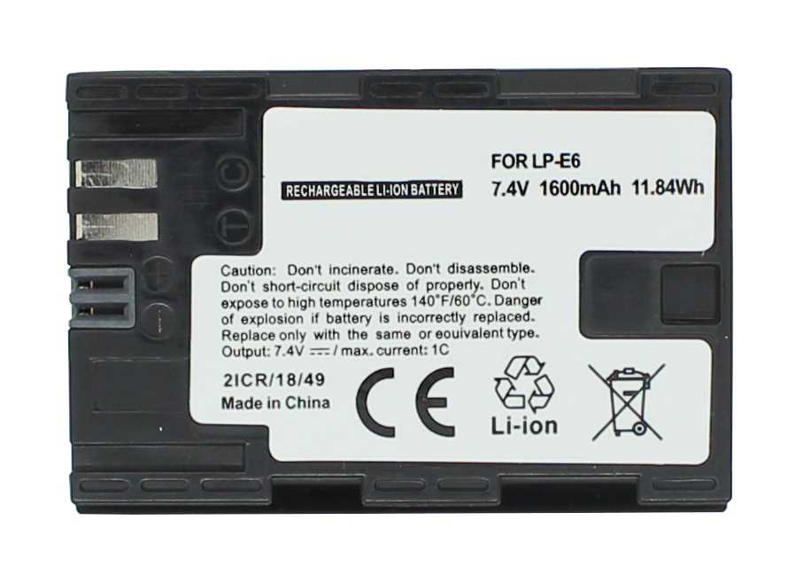 Lithium-Ionen Akku mit 7,4V Nennspannung und 1600mAh Kapazität zur Stromversorgung kompakter Digital- und Videokamerasysteme. Der Energievorrat beträgt 11,84Wh und stellt die verfügbare Reserve für Bildsensor, Signalverarbeitung, Display und Speichersystem bereit, wenn Kamera und Zubehör ohne Netzbetrieb genutzt werden. Die Li-Ion-Chemie ist für wiederholte Ladezyklen ausgelegt und unterstützt regelmäßiges Laden und Entladen.