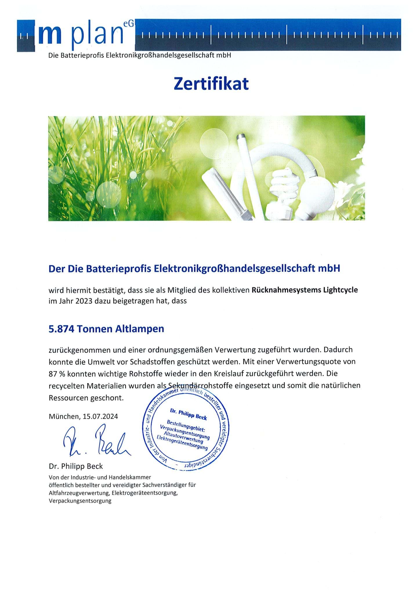 Zertifikat von Lightcycle über Rücknahme von Altlampen