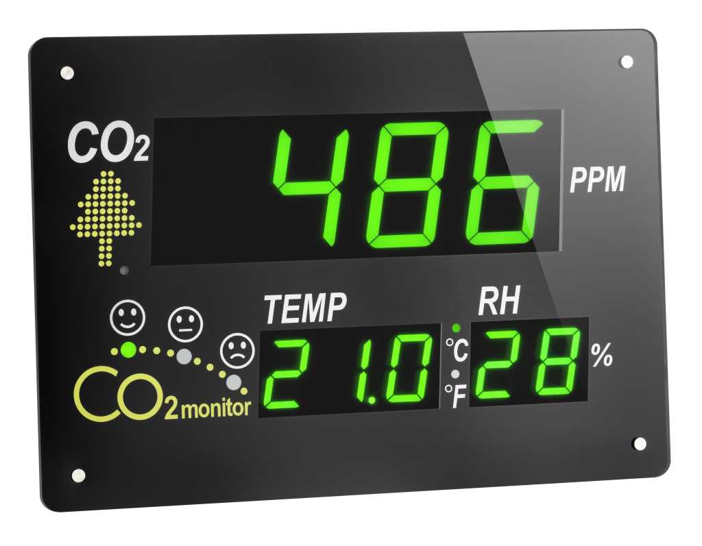 • weit sichtbares Display mit LED-Leuchtziffern und farbiger „Smiley”- Anzeige zur Überwachung der CO2-Konzentration in Gebäuden