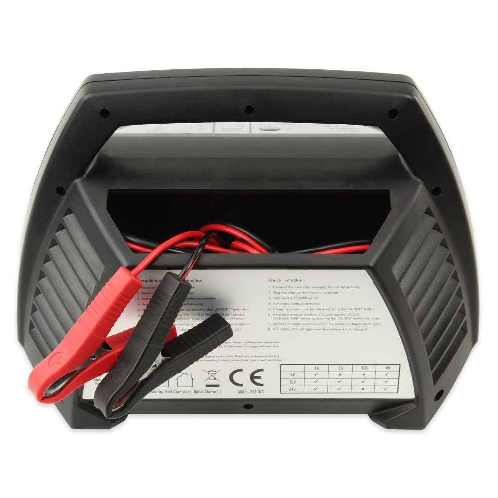 Das vollautomatische Ladegerät eignet sich für wartungsfreie Blei-Akkus (Blei-Gel, Blei-Säure, Blei-Vlies) mit 6, 12 oder 24 Volt. Nach erfolgreicher Kontaktierung der Polklemmen erkennt das Gerät automatisch die Ausgangsspannung des angeschlossenen Blei-Akkus und zeigt dies durch die entsprechende LED an. Ist der Akku tiefentladen, stellt ein automatischer REFRESH-Modus mittels pulsierender Ladeströme die Grundspannung wieder her, sodass der normale Ladevorgang gestartet werden kann. Je nach Spannung ist ein Ladestrom von 1, 5 oder 10 Ampere wählbar, wodurch Autobatterien sehr schnell, aber auch kleine Motorradbatterien sehr schonend geladen werden können. Wird keine Einstellung vorgenommen, erfolgt die Ladung mit dem voreingestellten Ladestrom von 1 Ampere. Bei niedrigen Temperaturen unter 5°C sorgt ein COLD TEMPERATURE-Modus (optional) dafür, dass der Blei-Akku trotz Kälte zu 100% vollgeladen wird. Ein übersichtliches LED-Display informiert sicher und zuverlässig über die getätigten Einstellungen sowie über den Ladefortschritt (35-70-100%). Dank eines speziellen, in Eigenentwicklung entstandenen Ladeverfahrens erfolgt nach der vollständigen Aufladung die automatische Umschaltung auf Erhaltungsladung. So wird der Akku nicht überladen und kann auch über einen längeren Zeitraum am Ladegerät angeschlossen bleiben. Akkus von Motorrad, Motorboot, Rasenmäher etc. kommen so gut über den Winter und sind bei Bedarf jederzeit einsatzbereit.
