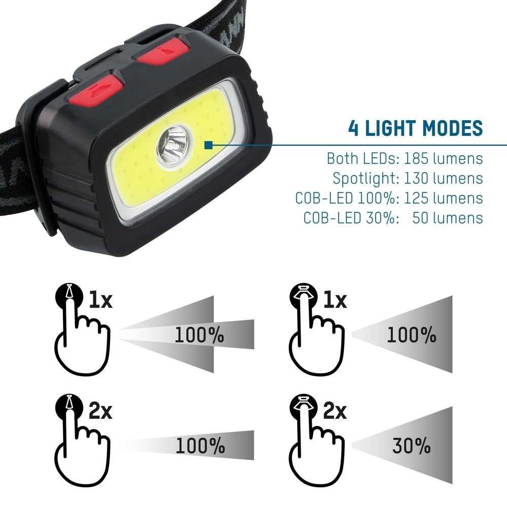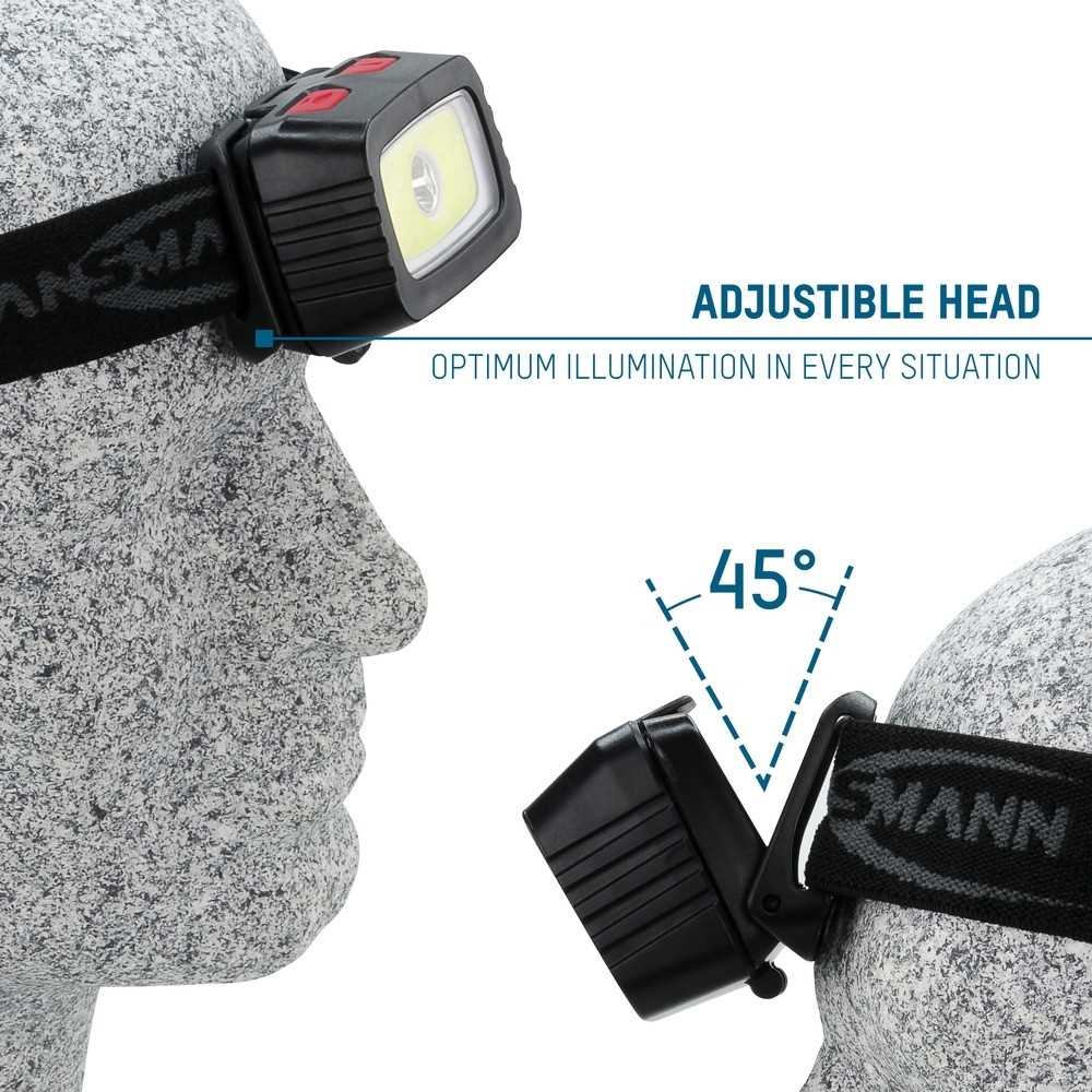 Die ultrahelle 3W LED sowie die 1.5W COB-LED und der um bis zu 45° verstellbare Neigungswinkel des Lampenkopfs garantieren eine optimale Ausleuchtung in allen Situationen.
