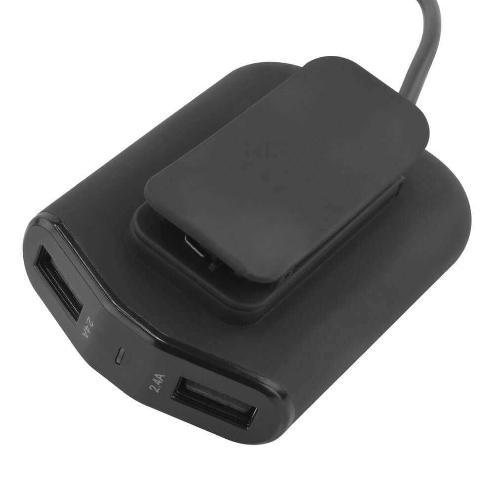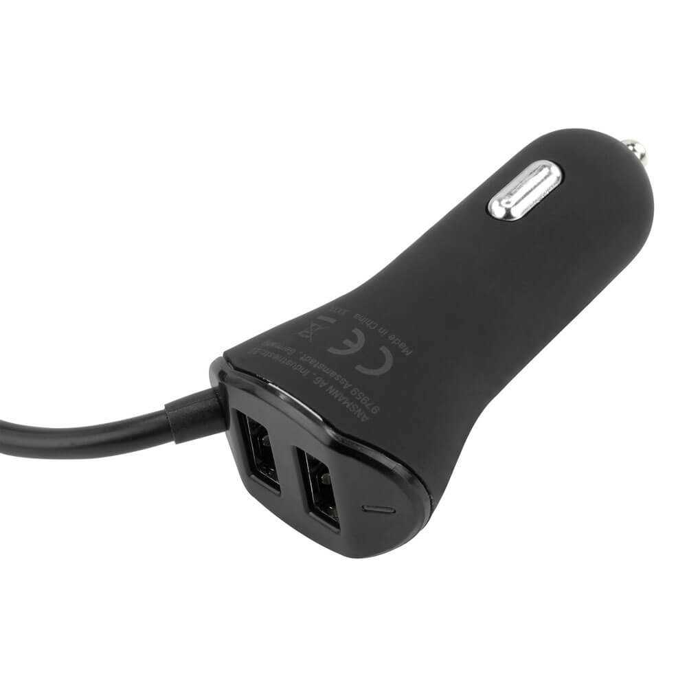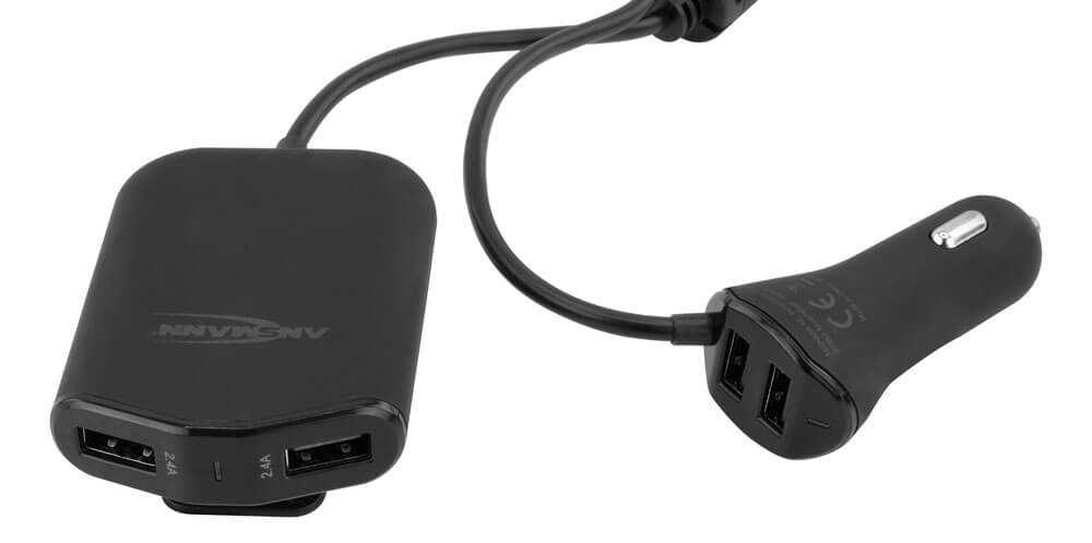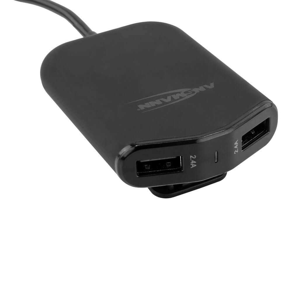 Der neue ANSMANN KFZ USB-Lader bietet eine Lademöglichkeit für bis zu vier Geräte (4 USB Ports) gleichzeitig - bei nur einer belegten 12V KFZ-Buchse. Ideal für die Nutzung im PKW oder im LKW kann man zwei der vier USB-Ports ganz einfach per Kabelverbindung z.B. zu den Rücksitzen verlegen. So bekommt man eine Komplettversorgung mit USB Ladebuchsen (4x 2400mA) für jeden Fahrzeuginsassen. Dank der praktischen Klemmhalterung wird das Ladegerät sicher an den Rücksitzen (z.B. in der Tasche hinter der Rückenlehne des Fahrers) befestigt, ohne, dass es im Innenraum unordentlich aussieht oder einen Kabelsalat erzeugt. Mit 1.80m Kabellänge ist die Verlängerung optimal auf die gängigen Fahrzeuge ausgelegt, ohne viel Überschuss und dennoch lang genug auch für größere Fahrzeuge.