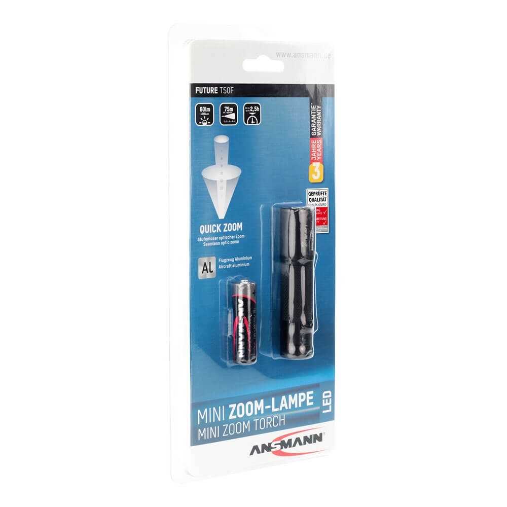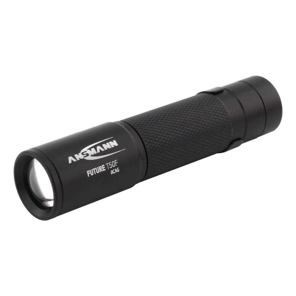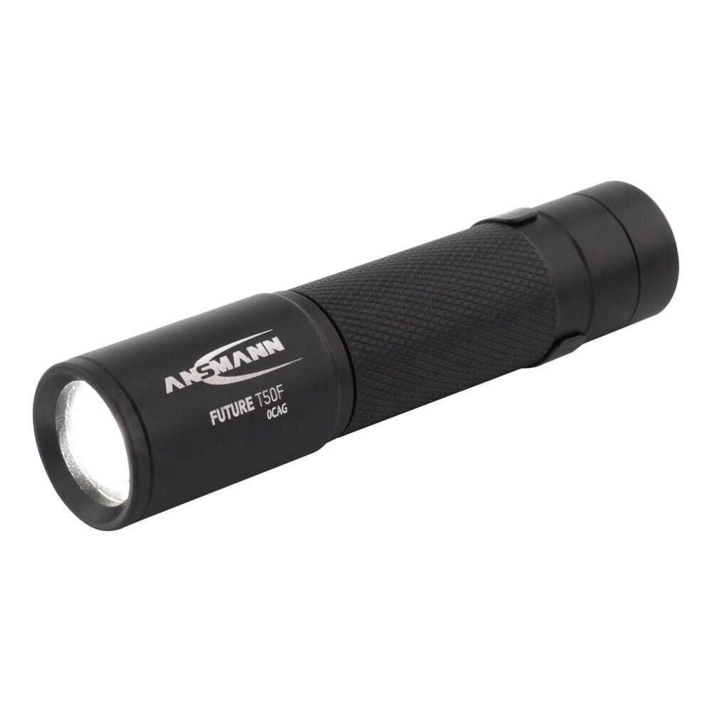 Die professionelle Taschenlampe FUTURE T50F von ANSMANN besticht durch ihre optimalen Gehäuseproportionen und griffige Oberfläche. Durch die Verwendung eines großen Endkappenschalters ist die Lampe ideal für den rauen Einsatz, auch im Einhandbetrieb oder mit Handschuhen.