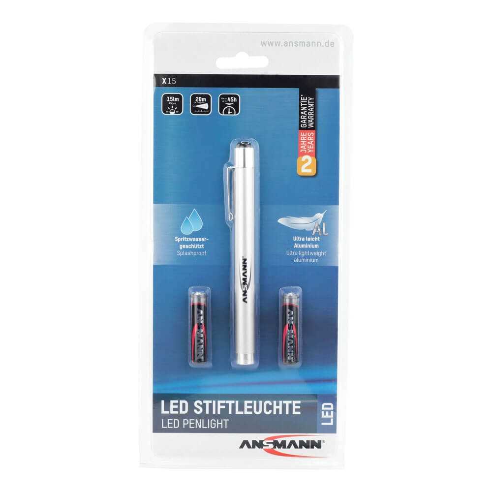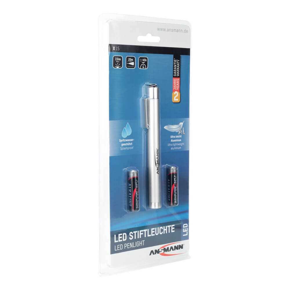 Die LED-Stiftleuchte X15 ist klein und handlich. Durch das robuste Metallgehäuse und das ansprechende und schlanke ANSMANN Design ist sie der optimale Begleiter in Arbeitsjacken oder Inspektionskoffern. Enthalten sind zwei Alkaline Micro AAA Batterien und der verstärkte Halteclip.