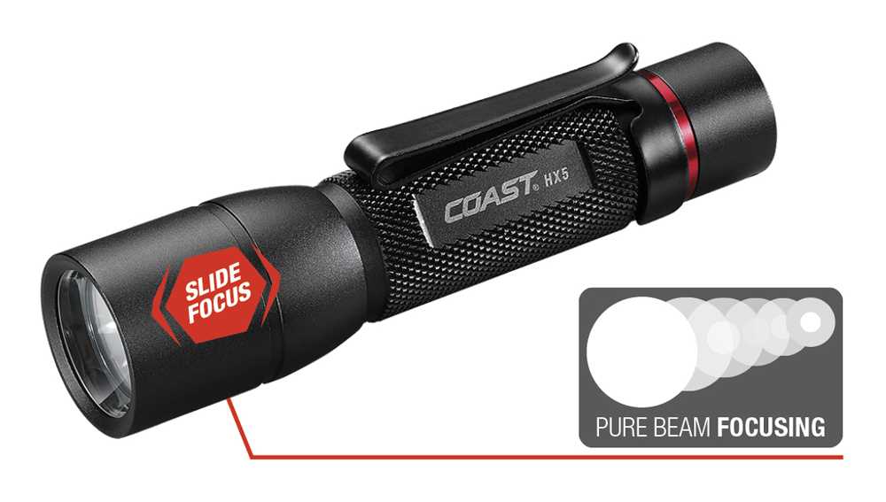 Die COAST HX5 fokussierbare LED-Taschenlampe ist der Kraftprotz unter den kompakten Taschenlampen. Die COAST HX5 kann mit verschiedenen Energiequellen betrieben werden: 1x AA Alkaline (130 Lumen*), Ni-MH AA Akku (125 Lumen*) oder mit einem Li-Ion 14500 Akku (345 Lumen*). Neben der guten Ergonomie durch die kurze Bauweise mit „Slide Focus Control“ und dem rückseitigen Ein-/Ausschalter kann man alle Funktionen einhändig ausführen, auch mit Handschuhen. Als außerordentlich praktisch erweist sich auch der Clip, mit dem die Lampe in zwei Richtungen fixiert werden kann. Zum Beispiel am Ärmel einer Jacke, so bleiben die Hände frei. Die Umstellung vom großen Leuchtkreis zum „Bulls-Eye Spot Beam“ erfolgt über einfaches Schieben des Lampenkopfes.